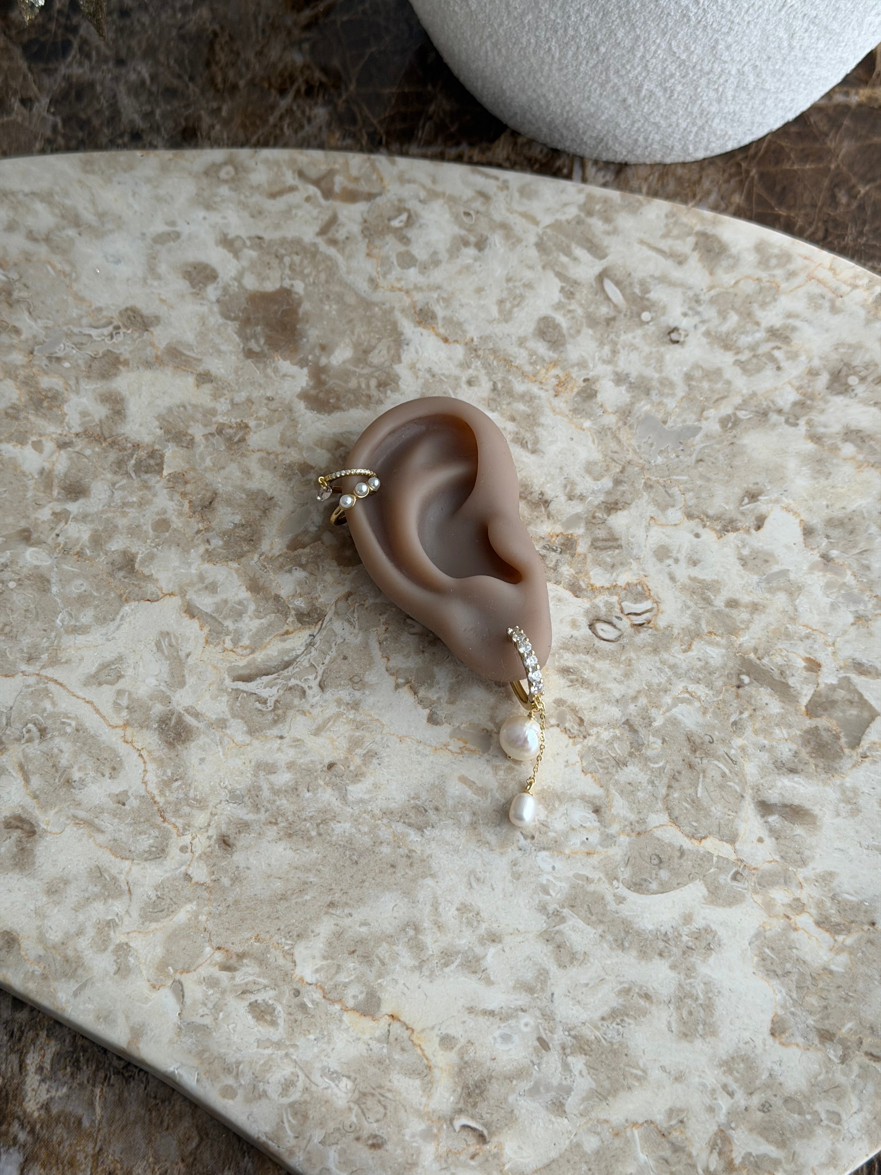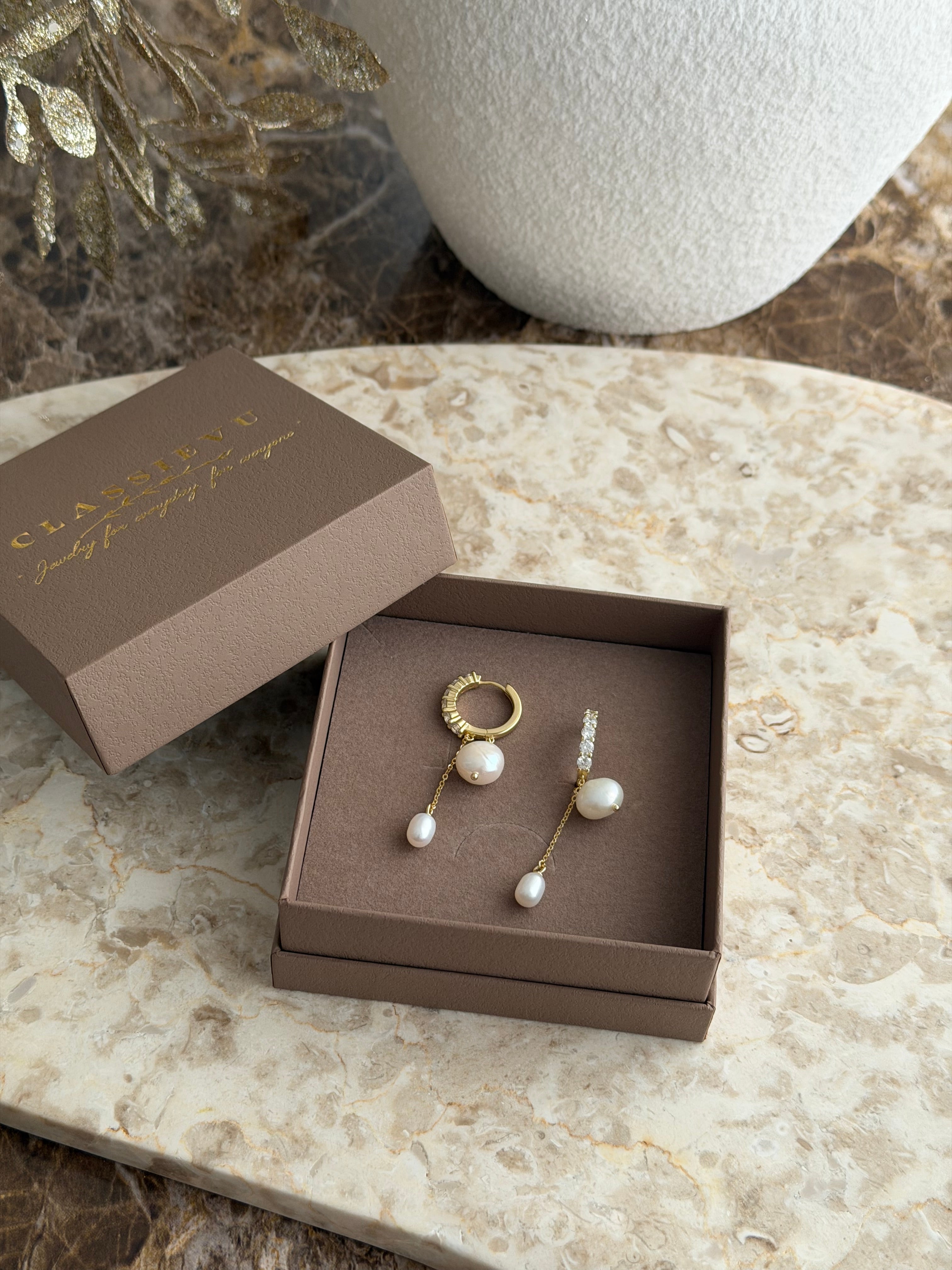 Die vergoldete Oberfläche verleiht den Ohrringen einen warmen, luxuriösen Glanz, während die Zirkonia-Steine das Licht auf faszinierende Weise reflektieren. Jede Ohrring-Perlen-Kombination ist ein Unikat – die natürlichen Süßwasserperlen variieren in Form und Farbe, was jedem Paar seinen individuellen Charakter gibt.