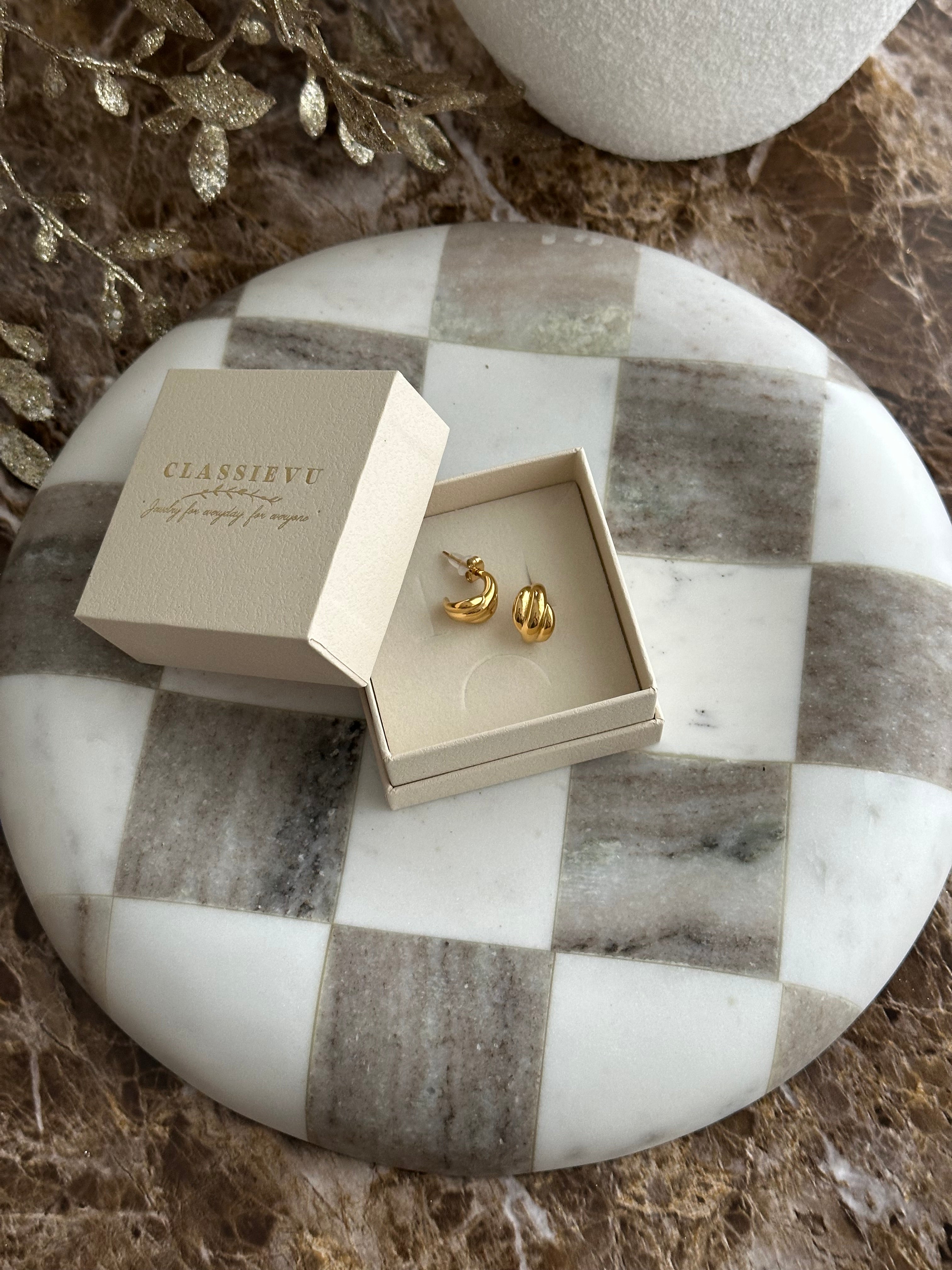 Our elegant earrings combine timeless design with high-quality craftsmanship – perfect for any occasion. Made from robust stainless steel and finished with 14-karat gold plating, they impress with their sophisticated shine and exceptional durability.